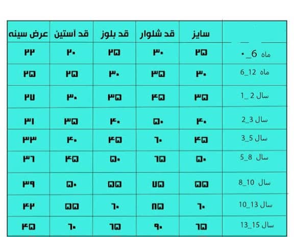 | سایز | قد کودک (سانتی متر) | دور سینه(سانتی متر) | سن تقریبی |